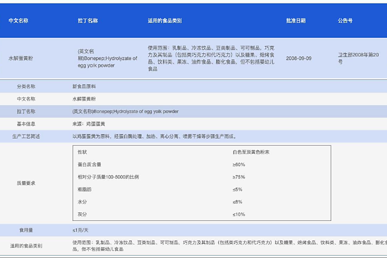 2008年9月9日的第20号新食品原料批准文件中,批准了水解蛋黄粉的使用,并规定了使用要求(如下)