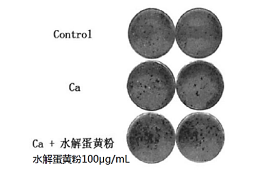 结果表明,添加Ca离子的水解蛋黄粉会增加成骨细胞的细胞增殖,提高成骨细胞分化和胶原蛋白的产生,而且会促进钙化结节的结果。
