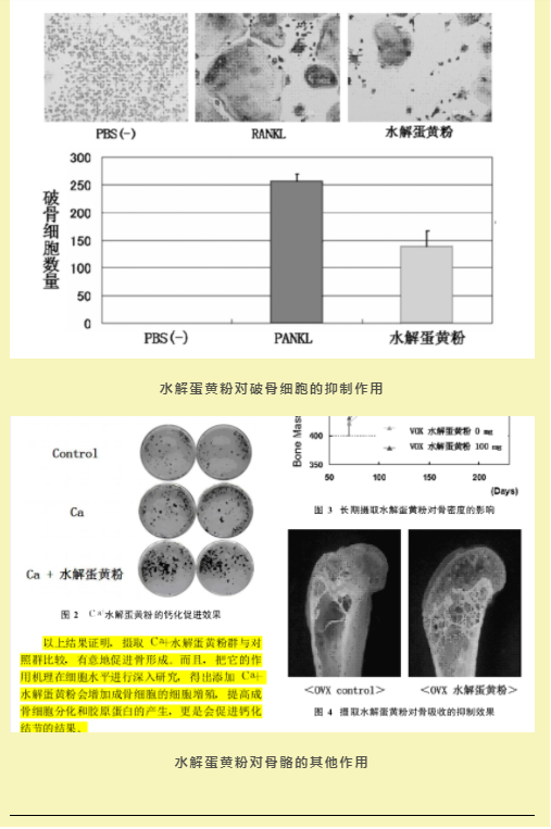 什么是水解蛋黄 为什么鸡蛋在适合条件下,21天后就能孵化成雏鸡?这说明鸡蛋里含有生命成长发育所必需的营养成分。科学家对该现象进行深入的研究并取得成果,发现鸡蛋黄中含有促进骨骼成长的成分。 水解蛋黄粉(蛋黄多肽),就是提取自鸡蛋黄的一种能促进骨骼成长的功能性物质。 它是以鸡蛋蛋黄为原料,经蛋白酶处理、加热、离心分离、喷雾干燥等步骤生产而制成的水溶性小分子多肽,一种天然的骨骼成长营养素,其相对分子质量一般在在100-5000Da。 漫步在夏天阳光下,给人一种快乐和温馨的感觉,多么美妙的意境。 2008年9月9日的第20号新食品原料批准文件中,批准了水解蛋黄粉的使用,并规定了使用要求(如下) Part.02 水解蛋黄的作用 1.通过刺激成骨细胞,促进骨骼增长因子的产生 2.激活骨骼成长部位细胞,支持和促进骨骼的伸长 3.促进骨骼的钙质沉淀,强化骨骼的韧性 4.抑制破骨细胞的成长,维持骨骼成分的平衡 打个比方解释一下~ 正常情况下,骨骼是由成骨细胞和破骨细胞有序地进行骨形成和骨吸收。 破骨细胞就像建骨工程里面的“拆迁队”,负责破坏吸收旧骨; 成骨细胞就像“扩建队”,重新塑造新骨。一旦破骨细胞活动比重过大,就会打破这种平衡,引起骨质疏松等问题,拖骨骼成长的“后腿”。 水解蛋黄粉的作用,既可以促进成骨细胞增殖,又可抑制破骨细胞分裂,维持两者的平衡状态,让骨骼更好地成长。 Part.03 水解蛋黄的功效研究 结果表明,以未添加水解蛋黄粉为对照组,添加0.1mg/mL和1.0mg/mL的细胞MC3T3-E1增殖率分别提高了21%和63%(P<0.05),一定剂量的水解蛋黄粉能够促进成骨细胞MC3T3-E1的增殖。 结果表明,添加Ca离子的水解蛋黄粉会增加成骨细胞的细胞增殖,提高成骨细胞分化和胶原蛋白的产生,而且会促进钙化结节的结果。 研究证明了添加水解蛋黄粉有意地促进了成骨细胞的细胞增殖,有意地促进骨形成;提高成骨细胞分化和胶原蛋白的产生,其结果就是促进骨骼增长。 Part.04 多吃鸡蛋有用吗? 当然没用!! 1.鸡蛋蛋黄只是水解蛋黄粉的原料 需要经过萃取和提纯等工艺,才能获得更有活性功能的水解蛋黄粉。 2.普通蛋黄的可吸收率极低 普通蛋黄吸收率低,而水解蛋黄粉是一种小分子肽,吸收率大大提升,更有利于孩子骨骼成长。 3.鸡蛋中胆固醇含量高 每100克蛋黄中胆固醇的含量为1500毫克以上,是除了动物脑之外胆固醇含量最高的日常食物了。而胆固醇是心脑血管疾病的发病因素之一,所以一般建议不要大量地食用鸡蛋,一天一个鸡蛋就好! 也就是说,通过多吃鸡蛋来补充这种营养物质,根本不现实!